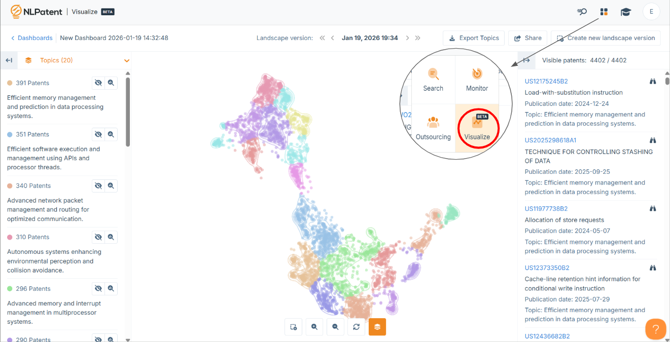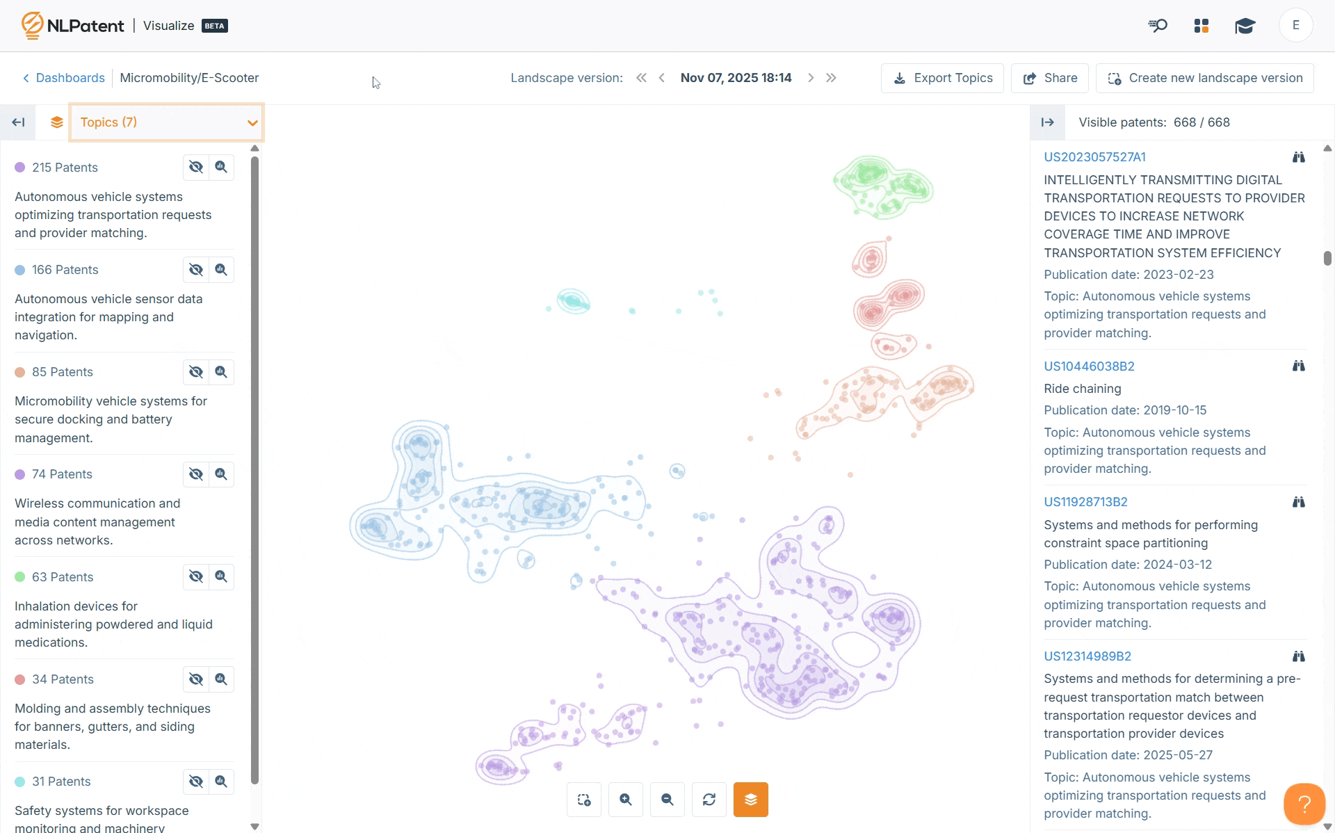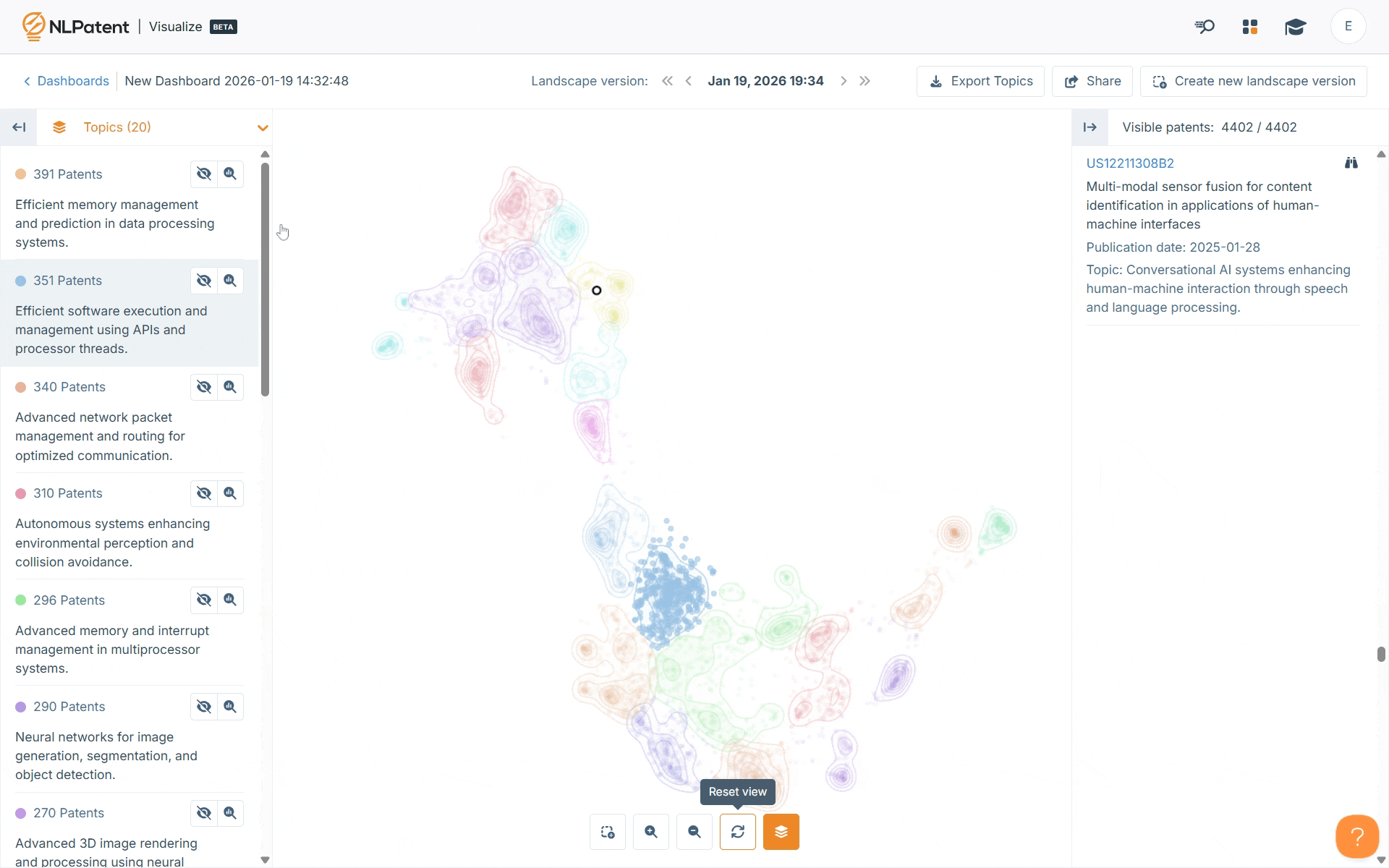 Users can now generate and explore patent landscapes in NLPatent. The new Visualize module, currently in beta, allows you to visualize your search results or a custom set of patents as part of an AI-generated patent landscape. NLPatent's patent AI automatically groups patents into topics and displays them in a 2D visualization that allows you to explore topics and the relationship between individual results.